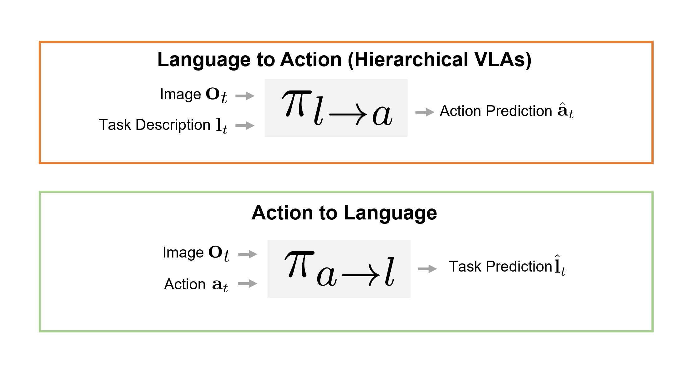 Traditional vision-language-action (VLA) models are trained solely in a language-to-action (L2A) direction—mapping task instructions and visual inputs to corresponding robot actions.