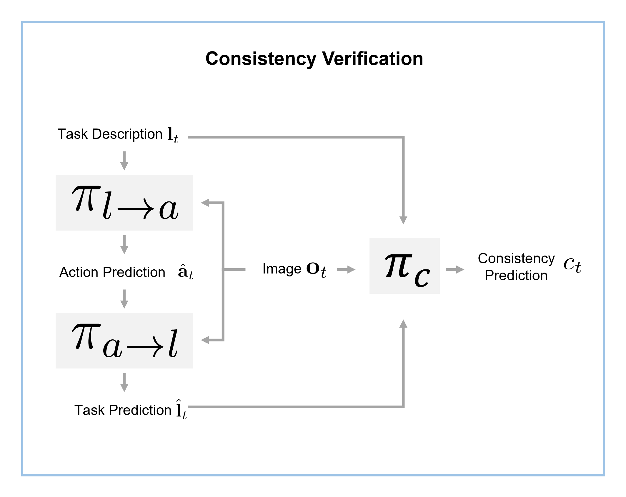 Language Consistency Verification (L2C): The L2C module verifies whether the generated action and reconstructed language remain consistent with the original instruction, enabling self-supervised feedback for continual improvement.